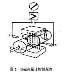 具有導電性的被測介質液態以一定的速度流動時,則在與流動方向垂直的方向上產生與流量成比例的感應電勢 E,其值為