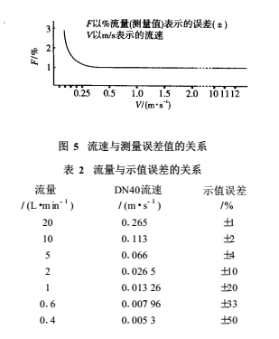 由EMF的測量原理可知,其流量的下限由同噪聲或偏移的信噪比S/N 來決定,其上限則由測量管內襯里的磨損和配管的經濟速度等來決定。一般當測量管內實際流速小于0.1m/s時,感應電動勢已變得十分微弱(幾微伏至零點幾微伏),此時噪聲的影響逐步變為主導,甚至淹沒信號電動勢。其流速和測量誤差的關系詳見圖 5和表2。
