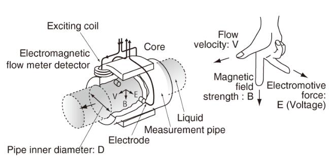 根據(jù)法拉*感應(yīng)定律,在磁場(chǎng)內(nèi)移動(dòng)導(dǎo)電液體會(huì)產(chǎn)生管內(nèi)徑,磁場(chǎng)強(qiáng)度和平均流速都成比例的電動(dòng)勢(shì)(電壓)。換句話說,在磁場(chǎng)中移動(dòng)的液體的流速被轉(zhuǎn)換成電力。(E正比于V×B×D)