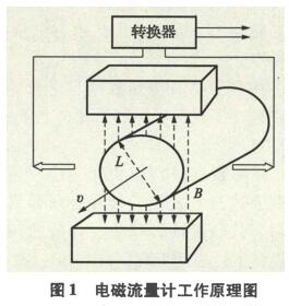 污水處理廠流量計是利用法拉*電磁感應定律測量,如圖1所示,用于測量電極與運動的流體構成的回路中產生的電參數,并根據公式換算成流體速度,再測量流通截面液位高度得到流通面積,兩者相乘得到所測流量。