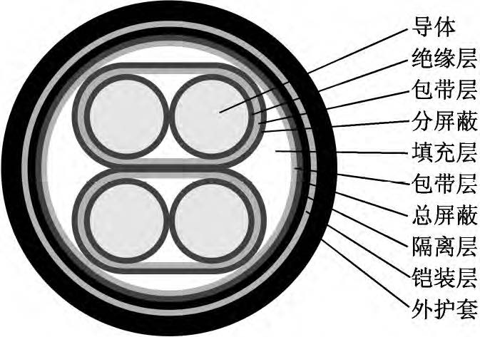 該新型電纜的結構如圖1所示。導體為單股退火鍍錫軟銅線,以提高導體的導電性和防腐蝕性。在導體外繞包一層薄F4(聚四氟乙烯)半導電帶,有利于降低導體和絕緣之間的摩擦起電噪音。絕緣采用材料較為純凈、介電常數(shù)較小、具有一定彈性的聚丙烯絕緣級材料,并采用擠壓式擠出,減小絕緣層與導體的間隙。采用對絞組作為信號傳輸線,由于在兩根傳輸線上感應的電壓接近相等,減小了電壓差值,提高了信號傳輸穩(wěn)定性;對絞組由兩種不同顏色絕緣線芯組成,相鄰線對對絞節(jié)距應不大于100mm。對絞分屏蔽組(即對對絞組進行分屏蔽,每對對絞組外繞包兩層聚酯帶和一層厚0.04mm鋁塑復合帶繞包,內置一根7×0.26mm鍍錫銅絞線作引流線)有利于對不同對絞組之間信號串音的抑制和隔離。對絞分屏蔽組同心式絞合成纜,在對絞分屏蔽組間填充非吸濕性材料,以保證纜芯圓整。在成纜纜芯外繞包兩層聚酯帶,再采用鋁塑復合帶繞包,內置鍍錫銅線作引流線,以提高電纜電磁屏蔽能力。總屏蔽層外擠包隔離層(隔離護套),隔離層采用絕緣級低密度聚乙烯材料。隔離層外采用鎧裝層,鎧裝材料為高導磁合金鋼帶,其為強磁材料,可將外來的磁通大部分限制在鎧裝層的外表面上(僅有少部分能進入被屏蔽的空間);鎧裝時對高導磁合金鋼帶采用縱包焊接,確保其形成一連續(xù)圓柱管;鎧裝層可提高電纜抗電磁干擾水平以及對電纜進行加強,減少電纜振動引起的電動勢。外護套采用藍色軟PVC(聚氯乙烯)護層級電纜材料擠包,實現(xiàn)電纜防護。