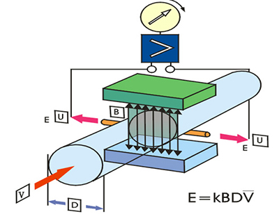 與此相似,如果在磁感應強度為B的均勻磁場中,垂直于磁場方向放一個內徑為D的不導磁管道,當導電液體在管道中以流速u運動時,導電液體就切割磁力線,如果在管道截面上垂直于磁場的 直徑兩側安裝一對電極(如圖所示)
