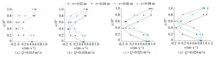 由圖5可知,當(dāng)e相同時(shí),斷面*小流速發(fā)生的位置相同,發(fā)生在浮體結(jié)構(gòu)下游回流區(qū)位置。隨著來(lái)流流量的增大,流經(jīng)浮體結(jié)構(gòu)下泄的水流流速在上層和下層水體中呈現(xiàn)增大的趨勢(shì)。浮體結(jié)構(gòu)位置不變,由于受到浮體結(jié)構(gòu)的擠壓,上游來(lái)流分別經(jīng)過浮體結(jié)構(gòu)上部、下部進(jìn)行泄流,因此在下游區(qū)域的上層、下層水體中,流速較大;受浮體結(jié)構(gòu)的阻擋,浮體結(jié)構(gòu)下游區(qū)域形成回流區(qū),流速較小。試驗(yàn)過程中,由于控制浮體結(jié)構(gòu)所在水域的上游、下游水位不發(fā)生變化,因此隨著來(lái)流流量的增大,流速呈現(xiàn)增大的趨勢(shì)。