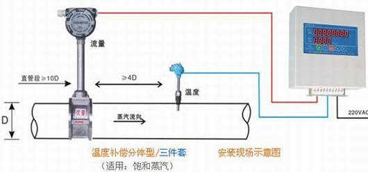 2、溫度補(bǔ)償一體型渦街流量計還帶有溫度傳感器,可以直接測量出飽和蒸汽的溫度并計算出壓力,從而顯示飽和蒸汽的質(zhì)量流量。