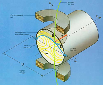 據法拉*電磁感應定律,測量管道內的流動的導電液體(等效于許多連續的導電薄圓盤)做垂直于磁場的運動,產生感應電動勢,電勢大小與流量相關。