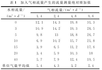 利用清水中渦輪的刻度方程計算加入不同氣體流量后渦輪響應頻率所對應的流量,即為加入氣體后的測量流量,再用所得測量流量減去配比的標準水流量,得到氣相加入后測量的絕對增加值,即加入氣相流量產(chǎn)生的測量誤差(見表1)。計算結(jié)果表明,加入氣體流量后,渦輪的測量流量明顯增加,尤其是液相流量較低時,增加的測量流量更高,氣體對流量測量產(chǎn)生了較大的測量誤差。低氣量下,平均1m3/d的氣量產(chǎn)生的測量誤差大約相當于5m3/d(絕對增加值)。