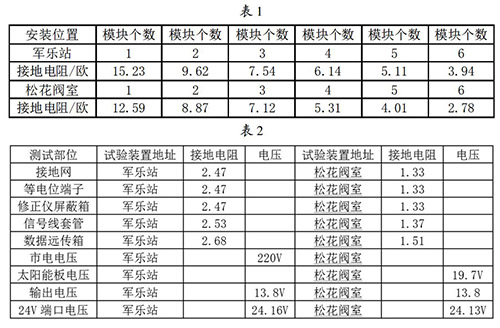 接地網(wǎng)的安裝與連接:接地網(wǎng)是整個乙二醇流量計防雷試驗比較關(guān)鍵的一個內(nèi)容,能不能準確的論證試驗的有效性,必須保證接地網(wǎng)達到標準的接地電阻,通過對實地地電阻率的測試,初步選擇6個接地模塊埋設(shè)并配用降阻劑使用,邊安裝邊測試直到達到標準值后才引入等電位箱。在軍樂站和松花閥室安裝模塊并測試數(shù)據(jù)見表1。