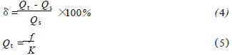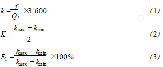 將過熱蒸汽流量計在標(biāo)準(zhǔn)水裝置上,分別用頻譜分析和脈沖計數(shù)的方法進(jìn)行標(biāo)定,流體介質(zhì)為水未加氣體,采用的標(biāo)準(zhǔn)傳感器為精度等級為0.2級的電磁流量計。在每個流量測量點上的儀表系數(shù)用公式(1)計算,然后用式(2)計算得到*終儀表系數(shù)K。Ql為被測水的流量值,f為每一個流量點得到的頻率,k為每個測量點得到的儀表系數(shù)。kmax、kmin分別為試驗流量范圍內(nèi)得到的*大與*小的儀表系數(shù)。儀表系數(shù)的線性度E1用式(3)來計算。