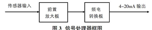信號處理器對渦街流量傳感器產生的頻率信號經過濾波、放大、頻電轉換等幾個環節處理,*終將頻率信號轉換為標準4~20mA信號輸出。信號處理器框圖如圖3所示。