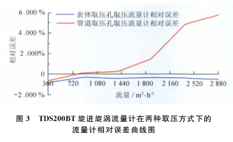 從以上數據表和曲線圖中可以看出:空氣流量計型號一定的情況下,用表體取壓孔取壓方式檢定流量計時流量計的線性度較好,用管道取壓孔取壓方式檢定流量計時流量計的線性度較差;流量測點相同的情況下,表體取壓孔取壓檢定方式的流量計誤差較小,管道取壓孔取壓檢定方式的流量計誤差較大;兩種取壓方式引起的誤差隨著流量的增大而逐漸增大,在流量為2 900m3/h時兩者相差近6.2%,遠遠超出了流量計的準確度等級。所以,在空氣流量計的檢定過程中,應避免在流量計表體取壓孔以外的地方取壓進行檢定。