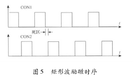 該電路主要由勵(lì)磁時(shí)序發(fā)生單元、三態(tài)緩沖器及隔離光耦組成。勵(lì)磁時(shí)序由雙氧水流量計(jì)系統(tǒng)的控制核心產(chǎn)生。采用DSP的EPWM外設(shè)模塊,通過設(shè)定其內(nèi)部定時(shí)器的工作模式發(fā)出所要求的勵(lì)磁頻率的勵(lì)磁時(shí)序PWM信號CT_1和CT_2。由于勵(lì)磁控制系統(tǒng)中的勵(lì)磁工作電源的電壓要比DSP的工作電源電壓高得多,為防止勵(lì)磁電路故障對系統(tǒng)控制核心產(chǎn)生致命影響,采用光耦將控制部分與勵(lì)磁部分進(jìn)行隔離。另外,由于DSP引腳的驅(qū)動(dòng)能力有限,所以在DSP與隔離光耦之間加入三態(tài)緩沖器以驅(qū)動(dòng)隔離光耦的輸入級。并且,DSP能夠通過GPIO口控制三態(tài)緩沖器上的使能引腳來使能和禁止勵(lì)磁,以在檢測到電路故障時(shí)迅速關(guān)斷H橋所有橋臂。該勵(lì)磁時(shí)序產(chǎn)生電路通過軟件編程可產(chǎn)生如圖5所示的單頻矩形波。在實(shí)際應(yīng)用中,由于組成H橋的達(dá)林頓三極管與MOS管導(dǎo)通與關(guān)斷的時(shí)間不一致,易在勵(lì)磁方向切換瞬間,產(chǎn)生上下橋臂同時(shí)導(dǎo)通的現(xiàn)象,反映在勵(lì)磁電流波形上為一幅值很高的窄脈沖。該脈沖電流不僅容易引起遲滯比較電路的誤輸出,從而導(dǎo)致高低壓切換電路與電流旁路電路的誤動(dòng)作,而且對恒流控制電路產(chǎn)生沖擊,減小三端穩(wěn)壓芯片的使用壽命,同時(shí)還會(huì)產(chǎn)生EMC電磁干擾,給測量精度帶來影響。所以實(shí)際應(yīng)用時(shí),如圖5所示對方波勵(lì)磁時(shí)序添加死區(qū),可以明顯減小上述現(xiàn)象。