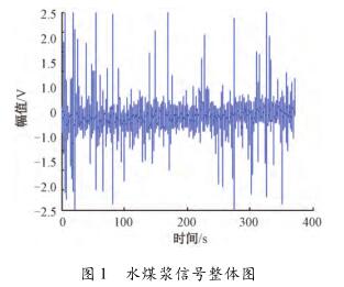 針對(duì)污泥計(jì)量表測(cè)量水煤漿時(shí)出現(xiàn)較大波動(dòng),甚至回零這一問題,特去某煤化工企業(yè)甲醇分公司進(jìn)行現(xiàn)場數(shù)據(jù)采集。該公司所使用的對(duì)置式四噴嘴氣化有4個(gè)噴嘴,噴嘴管道口徑為125mm,管中水煤漿流量基本穩(wěn)定在19m³/h(流速約為0.48m/s)。每條噴嘴煤漿線上安裝了3臺(tái)污泥計(jì)量表,每臺(tái)污泥計(jì)量表由傳感器和變送器兩部分組成。選擇其中1條水煤漿管線上的1臺(tái)污泥計(jì)量表進(jìn)行數(shù)據(jù)采集,因?yàn)樵撆_(tái)污泥計(jì)量表測(cè)量結(jié)果波動(dòng)大,甚至出現(xiàn)回零的現(xiàn)象。將課題組研制的基于DSP的電磁流量變送器的信號(hào)線和勵(lì)磁線接到該電磁流量傳感器的電極和勵(lì)磁線圈上,組合成完整的污泥計(jì)量表,進(jìn)行水煤漿數(shù)據(jù)采集。使用的電磁流量變送器是以TI公司DSP芯片TMS320F28335為核心,采用高頻勵(lì)磁方案,其硬件主要包括勵(lì)磁控制系統(tǒng)和信號(hào)采集處理系統(tǒng),具體的模塊有勵(lì)磁驅(qū)動(dòng)模塊、信號(hào)調(diào)理采集模塊、信號(hào)處理控制模塊、人機(jī)接口模塊、通信模塊及電源管理模塊。信號(hào)調(diào)理采集模塊中的調(diào)理電路對(duì)一次儀表輸出的信號(hào)進(jìn)行放大和濾波,截止頻率是2kHz,放大倍數(shù)約為230倍。通過NI公司USB-6216型號(hào)的數(shù)據(jù)采集卡進(jìn)行數(shù)據(jù)采集,把調(diào)理電路的輸出端連接到數(shù)據(jù)采集卡的一個(gè)差分輸入端,并設(shè)置數(shù)據(jù)采集卡工作在差分的測(cè)量模式,設(shè)置采集卡的采樣頻率為10kHz。采集多組水煤漿信號(hào)數(shù)據(jù),每組數(shù)據(jù)的時(shí)間長度為5min。