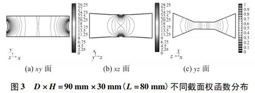 4) 圖 3( c) 、圖 4( c) 的 yz 面權函數分布表明,D = 90 mm時的權函數等勢線間距略大于 D = 60 mm 時的權函數等勢線間距,權函數變化梯度較小,且中心區(qū)域的權函數等勢線逐漸變?yōu)橹本€,因此 D = 90 mm 的權函數分布更均勻一些,但是兩者區(qū)別很小,即寬度改變對 yz 面權函數分布影響很小。圖 4( c) 、圖 5( c) 的 yz 面權函數分布表明,H = 30 mm時的權函數等勢線間距較大,且中心區(qū)域的權函數等勢線逐漸變?yōu)橹本€,因此 H = 30 mm 的權函數分布更加均勻;