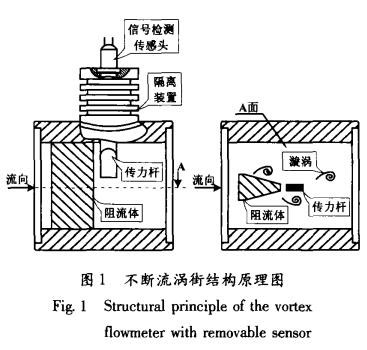 不斷流渦街同樣是以卡門渦街原理為依據(jù)測量流體流速的,但不斷流渦街表體已經在結構上有了質的改變。如圖1所示,它將普通渦街單一的信號檢測傳感頭改變?yōu)閭髁U與信號檢測傳感頭兩部分,并通過隔離裝置完全隔離。當表體中流過流體并產生漩渦時,由傳力桿檢測漩渦的變化,并以力的形式傳遞給信號檢測傳感頭,完成了力信號到電信號的轉換過程。雖然傳力桿與流體直接接觸,但其本身只是進行力傳輸?shù)母軛U,因此,只對外形尺寸及鋼材選擇上具有要求。而信號檢測傳感頭是通過隔離裝置與流體完全密閉隔離的,再加上隔離裝置本身具有的散熱功能,使得信號檢測傳感頭的使用溫度要遠遠低于流體的實際溫度,從而有效地提高了普通信號檢測傳感頭的可測介質溫度。同時,不斷流渦街在進行維修更換信號檢測傳感頭時,并不影響工藝管道內流體的流動,真正實現(xiàn)了信號檢測傳感頭的不斷流拆裝維護。