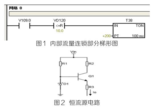 (2)PLC及模塊。PLC及模塊是自動化控制系統主要設備,且PLC及模塊屬于高集成高精密電子設備,保持室內整潔舒適,可以提高自動化系統運行穩定性。PLC及模塊硬件運行可靠,內部控制程序是其控制核心軟件,如PLC硬件出現故障或損壞一般直接更換,但原內部控制軟件無法上傳,整個控制系統成失控狀態。所以其內部控制程序在調試驗收合格后應及時備份并做好標記,為以后修復PLC故障提供保障。PLC系統的維護技術人員需掌握一定基礎PLC控制邏輯原理,對準確判斷PLC故障點有很大的幫助。例如選礦廠水泵房S7-200系列PLC自動抽水系統出現如下故障 :觸摸屏能控制變頻器啟動水泵抽水,但在短時間內會自動停泵,導致無法正常抽水。通過故障現象可初步判斷PLC及模塊硬件設備正常,主要由于某個變量有問題導致連鎖停機。打開備份PLC控制梯形圖程序進行相關分析,原來是高溫液體流量計瞬時流量數值做了連鎖,其在一定時間內瞬時流量不大于10m 3 /h時,自動停泵,電磁流量模擬量輸出電流值僅為4ma且無變化,確定高溫液體流量計有故障??膳R時應急維修,模擬量模塊輸入模擬電流值10ma~20ma之間一固定數值即可恢復正常運行。制作簡單恒流源電路代替高溫液體流量計輸出的模擬電流量,實現解決水泵無法正常運行的故障。