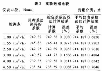 被檢儀表:公稱通徑分別為10mm和15mm的渦輪流量傳感器各一臺;檢定裝置:靜態稱重法標準水流量檢定裝置,系統精度+0.2%。分別采用常規的平均儀表系數法和檢定系數折線法進行標.定,并與作為標準的靜態稱重法的檢定結果進行比對,結果見表1.表2。