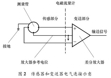 液體流量計主要由兩部分組成:流量傳感器和信號變送器,如圖 2 所示。傳感器上的勵磁線圈接受變送器傳輸來的勵磁電流產生磁場,輸出感應電動勢信號;信號變送器則將感應電動勢信號轉換為流量信號或模擬量信號送至控制系統(tǒng)。液體流量計按組成方式分為一體式和分體式。液體流量計穩(wěn)定工作另外一個重要條件是接地。當流體流動穿過磁場時,以導電流體本身作為參考電位,在測量管一側電極產生正電勢,另一側產生負電勢,形成電勢差。但此電動勢信號一般只有幾毫伏,易受外界干擾。為防止干擾,將參考電位接入大地作為零電位,保證傳感器輸出精確穩(wěn)定的信號。傳感器和轉換器的接地端必須與被測介質同電位,才能構成對稱的輸入輸出回路。