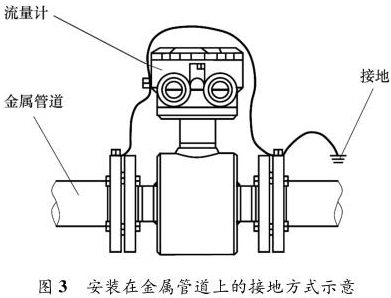 液體流量計安裝在金屬管道上,安裝時將金屬管道與液體流量計相連接,接地線再接入接地網,如圖 3 所示。