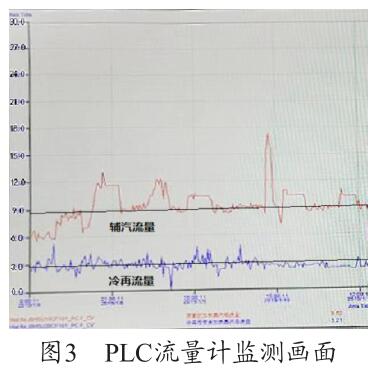 通過圖3 PLC 流量計監測畫面可以看出,PLC 上輔汽測量用的氣體流量計的量程設置為30t/h,現場設備量程實際為6t/h,兩者嚴重不符,因此測量值4t/h 為錯誤值(單臺機組運行),需要對程序進行修改。