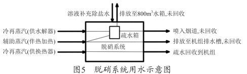 從圖5可以看出,脫硝系統所使用的冷再蒸汽和輔助蒸汽換熱后全部冷凝為疏水,供水解器的蒸汽和部分伴熱加熱的蒸汽回收至脫硝系統的疏水箱,部分伴熱蒸汽疏水直接排放至機組排水槽,未進行回收。疏水箱的水一部分被脫硝系統利用,另一部分排放至機組800m 3 水箱,未進行回收。下面結合耗水量對蒸汽耗量進行判斷 :