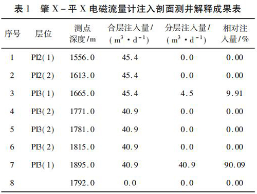 2017 年 9 月在大慶油田采油八廠肇 X - 平 X 水平井注水井中*次進行了水平井注入剖面測井現(xiàn)場試驗。該井斜深2 055. 42 m,水平段長度為568. 46 m,試驗目的是通過注入剖面測井了解該井各層段的注水情況,同時對水平井測井工藝、儀器的適用性、井下牽引器及井口輔助裝置等設備的工作有效性和可靠性進行評價。現(xiàn)場試驗中,在密閉條件下錄取到了該井的注入剖面測井資料,進行了重復測量,重復測量結(jié)果在誤差允許范圍內(nèi),測井成果見表 1。該井施工壓力 6. 0 MPa,注入量45. 4 m3 /d,有 7 個射孔層,分 8 個測點測量,2 個層有吸入顯示,其中,P13( 1) ( 1 734 ~ 1 767 m) 層絕對吸入量4. 5 m3 /d,相對吸入量為9. 91 %,P13( 1) ( 1 899 ~1 943 m)層絕對吸入量 40. 9 m3 /d,相對吸入量為 90. 09% ,測井成果見表 1。通過與甲方的交流,再結(jié)合該井的動靜態(tài)資料及周圍井的工作狀況,采油廠的地質(zhì)人員認為本次測井結(jié)果能比較準確地反映該井的注入情況。