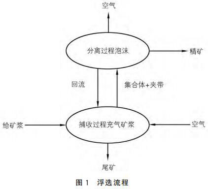 浮選是依據(jù)礦物原料表面的化學性質,向待浮選的礦漿中加入浮選藥劑和空氣,使其與礦漿充分融合,并根據(jù)各礦物原料的黏附程度的不同,分選出不同的礦物。浮選過程一般分為礦漿碰撞、黏附、上浮以及精煤溢出四個階段。礦物原料在浮選藥劑的作用下,與 空氣發(fā)生器產生的小氣泡發(fā)生充分碰撞,進行礦物捕集。利用礦物間的疏水特性,礦物粘附于氣泡表面,氣泡不斷上浮,形成精礦泡沫層,精礦溢出浮選柱;由于尾礦的親水特性,尾礦沉入底部并排出。浮選流程如圖1所示。