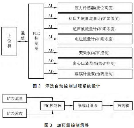 圖3中的礦漿流量與礦漿濃度分別由科氏質量流量計和超聲波流量計測得,并 以4~20mA 電流信號傳送給 PLC控制器。由 PLC控制器根據(jù)電流信號值計算出實際的礦漿濃度和礦漿流量值,對上述兩個值進行邏輯處理以及運算,得出實時加藥量。PLC 控制器將計算出的實時加藥量數(shù)據(jù)以4~20mA 的電流信號發(fā)送給隔膜計量泵,由其控制并實現(xiàn)加藥量過程的自動控制。