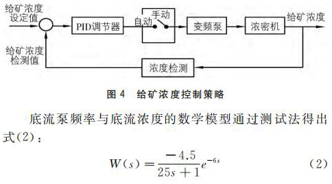 給礦濃度控制策略采用常規(guī)的PID調節(jié)器實現(xiàn),如圖4所示。在該控制系統(tǒng)中,給礦濃度設定值以及反饋的給礦濃度檢測值為PID調節(jié)器的輸 入,PID 調節(jié)器的輸出為變頻泵的頻率。該頻率可進行自動與手動兩種控制模式。以變頻控制方式對濃密機的底流泵進行精密轉速控制,即可控制濃密機排出的底流礦漿的濃度。