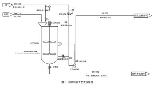 通過以上煤漿提濃通用方法優(yōu)缺點(diǎn)比較可以了解到,在現(xiàn)有設(shè)計(jì)條件基礎(chǔ)上,煤漿濃度提升會(huì)帶來一定設(shè)備損耗及能源損耗。針對(duì)這種情況,為了達(dá)到節(jié)能而保證實(shí)驗(yàn)室氣體流量計(jì)不跑漿,對(duì)于磨機(jī)跑漿問題進(jìn)行改善,對(duì)跑漿進(jìn)行回收,重新送回磨煤機(jī)進(jìn)行二次研磨,降低了實(shí)驗(yàn)室氣體流量計(jì)入口原料煤的粒度;同時(shí)降低了人員勞動(dòng)強(qiáng)度,改善了現(xiàn)場(chǎng)衛(wèi)生情況。具體跑漿回收裝置設(shè)計(jì)流程如圖 1 所示。