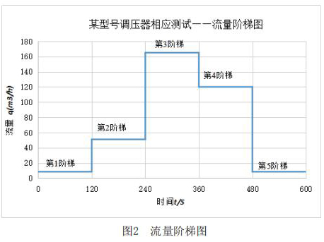 該測試主要利用實(shí)驗(yàn)室測試條件,模擬客戶現(xiàn)場使用情況。其主要測試內(nèi)容包括:測試電磁流量計(jì)在+23℃,-30℃和-40℃三種溫度下,電磁流量計(jì)出口壓力分別在2.1kPa和30kPa時,流量分別從*1階梯到*5階梯時的響應(yīng)速度,客戶所提供的流量階梯如圖2所示。橫軸表示下游球閥開啟動作時間,縱軸表示衛(wèi)生級電磁流量計(jì)下游需要的流量q。