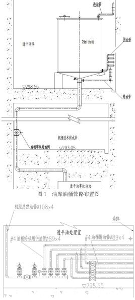 透平油油庫及油處理室設置在發電機出線層。油庫中安裝4個油桶,單個油桶容積為25m3。按照功能劃分為2個運行油桶,2個凈油桶。每個油桶ding部設置一根油桶進油管,油桶下部設置一根給機組供油管,油桶底部設置一根事故排油管,經事故排油閥引入事故油池中,事故排油管上引出一根油桶排油管。各油桶的進油管、供油管、排油管分別引入油處理室中。具體布置形式可見圖1所示。油處理室中設置一個容積為1m3的移動油箱,用于向設備添油或臨時儲油。