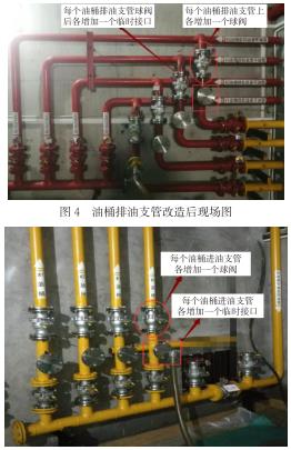 (1)改造后,各個油桶的油處理工作實現互不影響的效果。油桶排油支管的臨時接口兩端的球閥都是近油桶側的閥門,油桶進油支管的臨時接口ding部的球閥為近油桶側的閥門。油桶需進行油過濾工作時,僅需將濾油機的進油管接在該油桶排油支管新增的臨時接口上,同時濾油機的出油管連接在該油桶進油支管新增的臨時接口上,然后分別打開進油支管和排油支管新增臨時接口ding部的近油桶側球閥,即可開始形成循環油路進行油桶內的透平油過濾。同時未改變各個油桶中透平油的互相倒換、轉移功能。