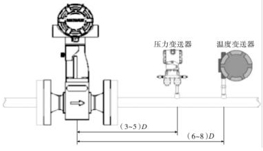 渦街氣體流量計的口徑如果與工藝管道相同,不能滿足流量儀表要求時,或者在此流速下測量準確度不能保證時,需要縮小儀表口徑,從而提高管內(nèi)流速,保證測量精度。上下游必須有足夠的直管段,若傳感器安裝點的上游在同一平面上有 2 個 90°彎頭時,上游直管段≥25D,下游直管段≥5D。根據(jù)測量的需要,需在渦街氣體流量計附近測量壓力和溫度時,測壓點應在傳感器下游的(3 ~5)D 處,測溫點應在傳感器下游的(6 ~8)D 處,如圖 3 所示。