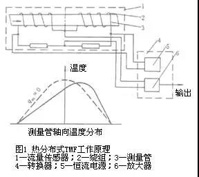 熱分布式tmf的工作原理如圖1所示,薄壁測量管3外壁繞著兩組兼作加熱器和檢測元件的繞組2,組成惠斯登電橋,由恒流電源5供給恒定熱量,通過線圈絕緣層、管壁、流體邊界層傳導(dǎo)熱量給管內(nèi)流體。邊界層內(nèi)熱的傳遞可以看作熱傳導(dǎo)方式實現(xiàn)的。在流量為零時,測量管上的溫度分布如圖下部虛線所示,相對于測量管中心的上下游是對稱的,由線圈和電阻組成的電橋處于平衡狀態(tài);當流體流動時,流體將上游的部分熱量帶給下游,導(dǎo)致溫度分布變化如實線所示,由電橋測出兩組線圈電阻值的變化,求得兩組線圈平均溫度差δt。便可按下式導(dǎo)出質(zhì)量流量qm,即