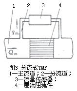 為了獲得良好的線形輸出,必須保持層流流動,測量管內(nèi)徑d設(shè)計得很小而長度l很長,即有很大l/d比值,流速低,流量小。為擴大儀表流量,還可采用在管道內(nèi)裝管束等層流阻流件;擴大更大流量和口徑還常采用分流方式,在主管道內(nèi)裝層流阻流件(見圖3)以恒定比值分流部分流體到流量傳感部件。有些型號儀表也有用文丘里噴嘴等代替層流阻流件。