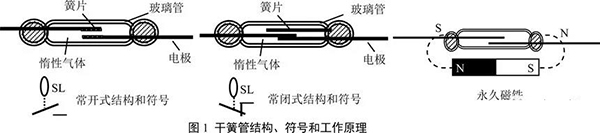 干簧管開關:由一組或幾組導磁金屬簧片封裝在充有惰性氣體的玻璃管中組成的元件,每組簧片既能導磁又能導電,起開關電路和磁路的雙重作用,如圖1。對于常開型:當干簧管在外加永久磁場或電磁場的作用時,干簧管中的兩根簧片分別被磁化,在兩根簧片接近的地方產生異性磁極而吸引,兩根簧片相接觸使電路導通。反過來,當磁場取消時,簧片依靠本身的彈性力恢復原狀,兩簧片分離,電路斷開,這樣便完成了一個開關的作用。常閉型干簧管原理可自行分析。干簧開關有許多優點:由于接點密閉在充滿惰性氣體的玻璃管中,不易腐蝕、氧化和污染,接點免于維護;接通或釋放的時間只有1~3毫秒,僅為電磁繼電器的1/5~1/10,可以作為速動開關使用;由于接點部分使用了金、鐒、鈀合金鍍層,壽命長,開關約為106~107次。