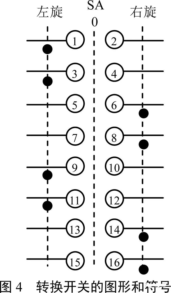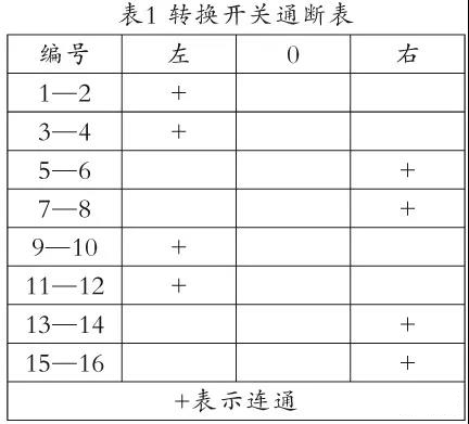 圖4是一款轉換開關的圖形和符號,表1是它在左旋和右旋兩個部位時8個開關對應的通斷情況。
