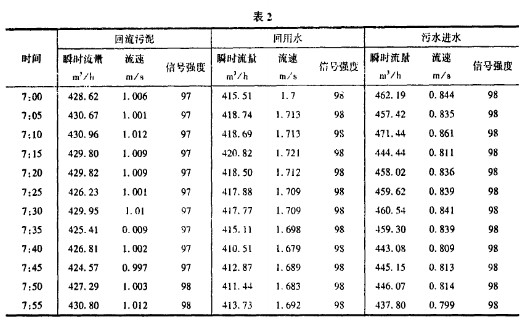 下面是隨機(jī)地從計(jì)算機(jī)中抽取的某一日的幾組數(shù)據(jù)(表2)。從表中可以看出采用超聲波流量計(jì)側(cè)量數(shù)據(jù)精確度較高,讀取數(shù)據(jù)方便,從信號強(qiáng)度上可以看出,在測量回流污泥時(shí),信號強(qiáng)度較低,這是由于液體濁度較高,含有較大固體顆粒引起信號衰減造成的。
